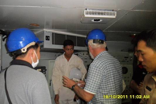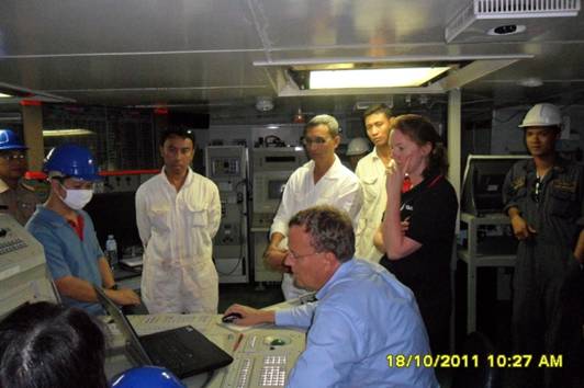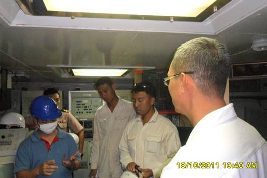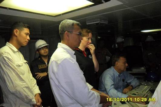 น.อ.ไพศาล วงค์เมฆ ผู้บังคับการ ร.ล.นเรศวร ให้การต้อนรับคณะกรรมการอำนวยการปรับปรุง เรือฟริเกต ชุด ร.ล.นเรศวร ในการสำรวจพื้นที่และระบบต่างๆ ภายในเรือ เมื่อ ๑๘ ตุลาคม ๒๕๕๔