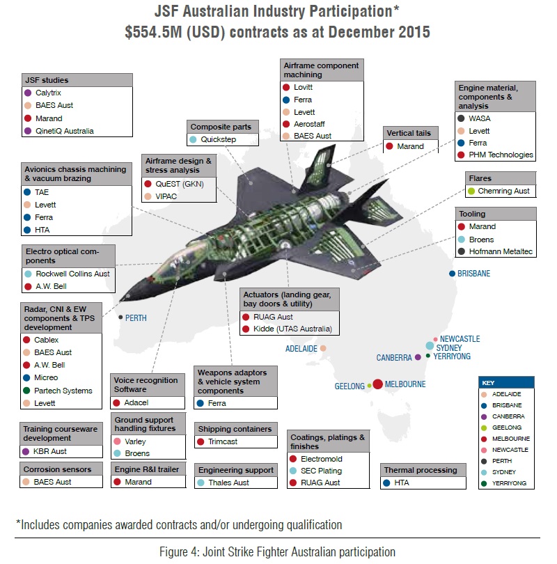 F-35A Lightning II จำนวน 2 ลำ ถูกส่งมายังออสเตรเลียแล้ว ความน่าสนใจของการจัดหาเครื่องบินขับไล่ยุค 5 จำนวน 72 ลำไม่ใช่ที่ประสิทธิภาพดีไม่ดี ความล่าช้าของโครงการ หรือปัญหาต่างๆที่ตามมาแต่อย่างใด ทว่ากลับเป็นเรื่องการเข้าร่วมของอุตสาหกรรมป้องกันประเทศต่างหาก โครงการ Joint Strike Fighters หรือ JSF จะมีปริมาณการผลิตเครื่องบินสุงถึงประมาณ 3,000 ลำในเวลา 30 ปี ออสเตรเลียเป็นชาติที่เข้าร่วมโครงการนี้มาตั้งแต่แรก มีบริษัทน้อยใหญ่ภายในประเทศจำนวนมากเข้าร่วมในการผลิตด้วย นับจนถึงสิ้นเดือนธันวาคม 2015 บริษัทจากออสเตรเลียได้รับสัญญาสั่งซื้อจากโครงการJSFรวมถึง 554.5 ล้านเหรียญแล้ว และจะมีสัญญาสั่งซื้อเข้ามาอีกเรื่อยๆตราบใดที่F-35 ยังเปิดสายการผลิต นอกจากนี้ยังสามารถขายเป็นอะไหล่ในการซ่อมบำรุงได้อีกด้วย นั่นหมายถึงเงินก้อนโตที่ใช้ซื้อเครื่องบินรบ จะกลับคืนสู่ประเทศจำนวนหนึ่งมากน้อยก็ว่ากันไป