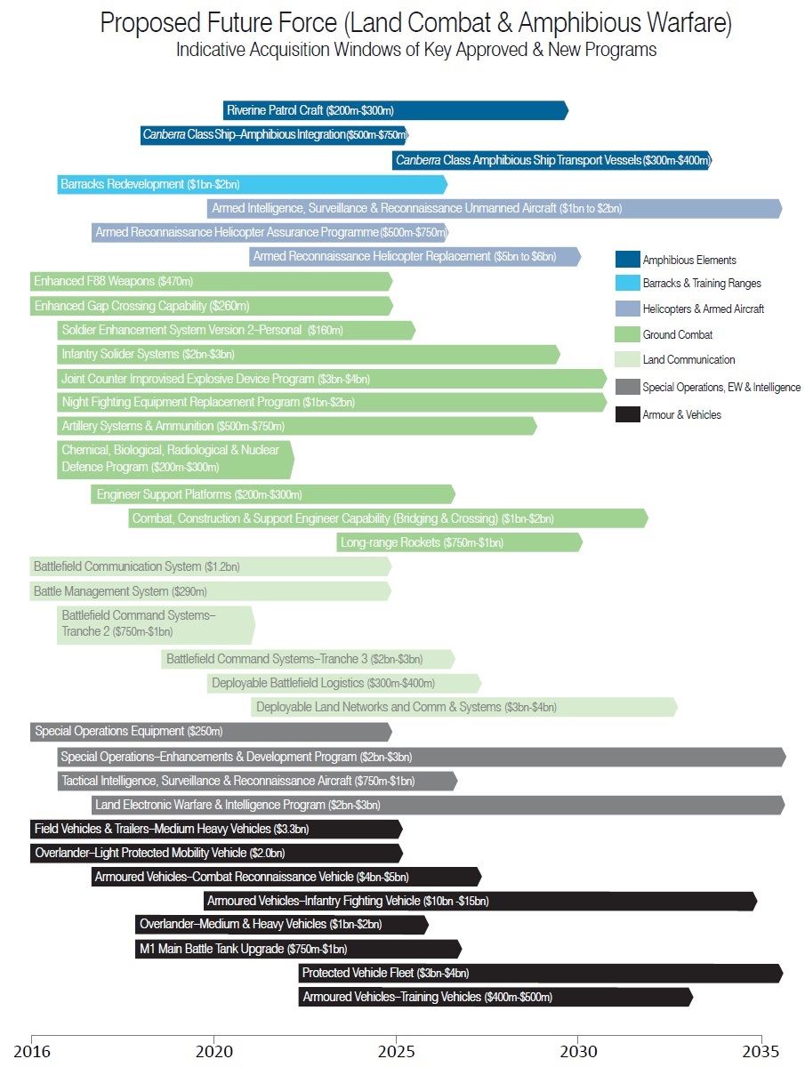 โครงการจัดหายานเกราะติดอาวุธรุ่นใหม่เข้าประจำการทดแทน ASLAV เป็นโครงการสำคัญมากเช่นกัน ภูมิประเทศของออสเตรเลียเหมาะสมกับยานเกราะล้อยางมากกว่ารถถัง เพราะรถมีความคล่องตัวสุงกว่า มีความเร็วในการเดินทางมากกว่า มีความอเนกประสงค์มากกว่า มีความยืดหยุ่นในทุกภาระกิจมากกว่า อีกหนึ่งโครงการที่น่าสนใจก็คือ โครงการจัดหาจรวดพื้น-สู่-พื้นระยะยิงไกลสุด 300 กิโลเมตรรุ่นใหม่ โดยจะมีกำหนดเข้าประจำการช่วงประมาณปี 2025