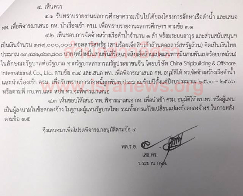 เปิดหนังสือ เสธ.ทร. ไฟเขียวตามผลสรุปศึกษาโครงการซื้อเรือดำน้ำจีน 1.34 หมื่นล้าน ทำแบบจีทูจีกับจีน ชงกลาโหมเพื่อนำเสนอเข้าที่ประชุม ครม. อนุมัติต่อไป ชี้เป็นความจำเป็นเร่งด่วน เพื่อรักษาอธิปไตยทางทะเล ยันคุ้มค่า-น่าเชื่อถือ