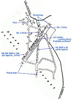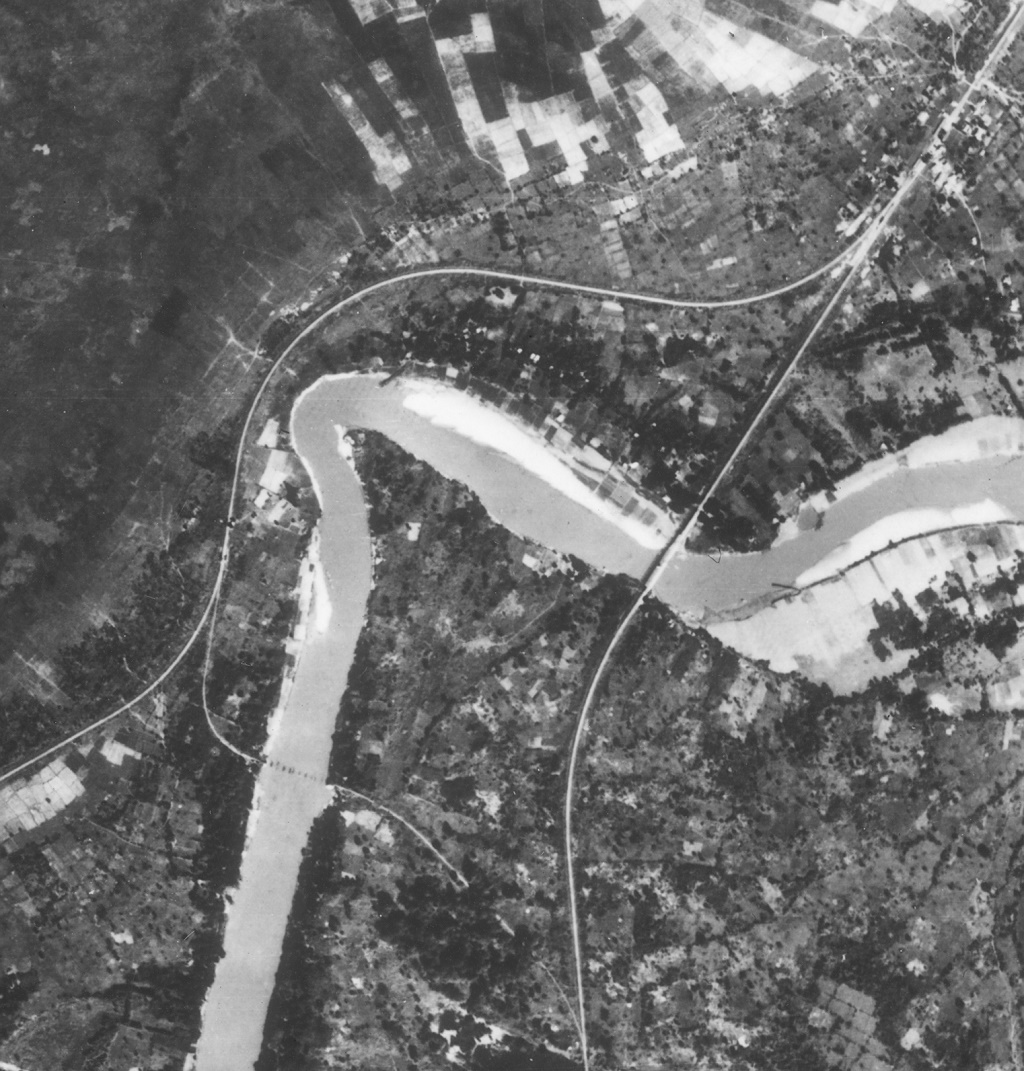 ภาพถ่ายทางอากาศช่วงต้นปี 2488 สนามบินขนาดเล็กที่แม่เมาะเสร็จสมบรูณ์แล้ว ปัจจุบันกลายเป็นนาข้าวและบ้านเรือนของคนในชุมชม