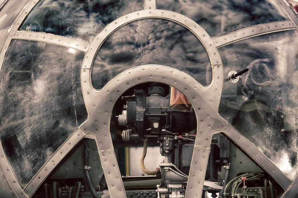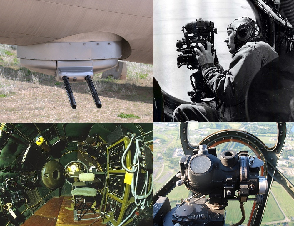 อุปกรณ์ทันสมัยที่ติดตั้งอยู่บนเครื่องบินทิ้งระเบิด B-29 ขวามือด้านบนพลปืนกำลังควบคุมปืนกล 12.7 มม.ของตนเองด้วยอุปกรณ์ที่มีชื่อเรียกว่า computing gunsight
