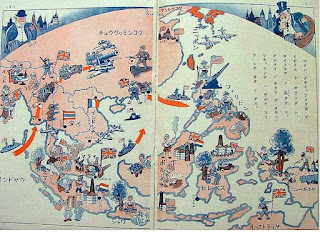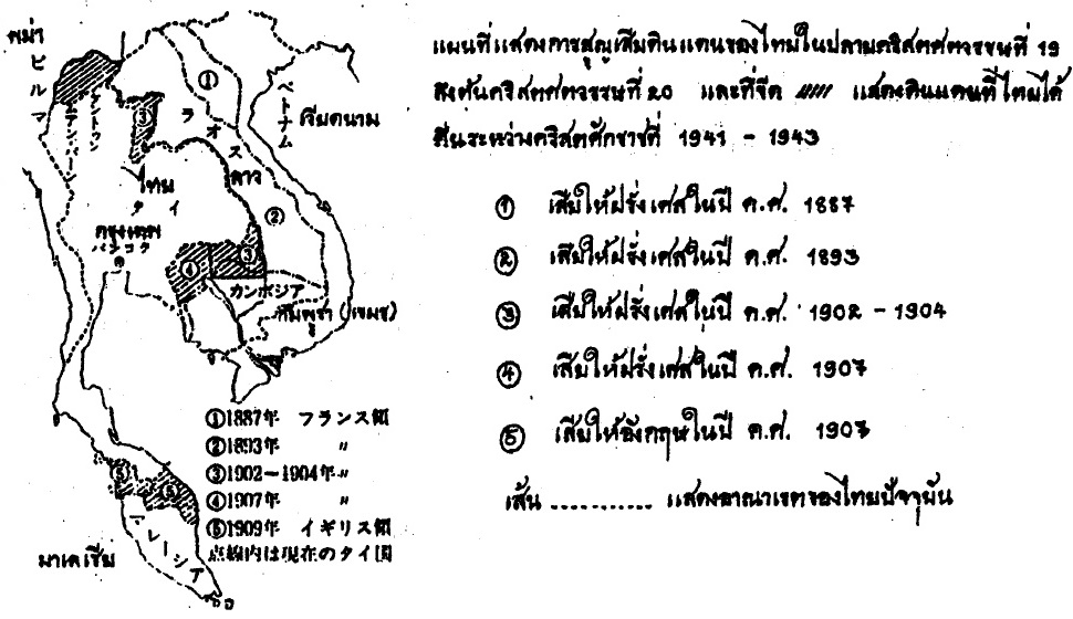 แล้วทำไมญี่ปุ่นถึงได้ท้าตีท้าต่อยไปทั่วโลก ขอนำผู้อ่านมายังหนังสือเรียนระดับประถมศึกษา ภาพการ์ตูนด้านบนมาจากหนังสือเล่มหนึ่ง อธิบายมุมมองที่มีต่อสถานการณ์ได้เป็นอย่างดี ในภาพแสดงแผนที่ทวีปเอเชียแฟซิฟิคก่อนสงคราม ตกอยู่ภายใต้การปกครองของอังกฤษ ฝรั่งเศส เนเธอร์แลนด์ และอเมริกาถึง 90 เปอร์เซนต์ กลางภาพค่อนไปทางซ้ายมือจะเห็นธงไตรรงค์ของไทย โบกสะบัดท่ามกลางธงยูเนี่ยนแจ๊คและธงสามสีฝรั่งเศส ภาพนี้แสดงตัวผู้ร้ายได้อย่างชัดเจน