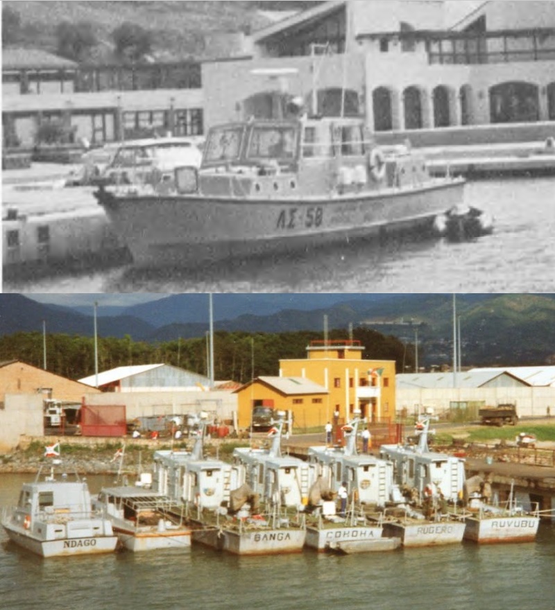 ภาพบนคือเรือตรวจการณ์ Lambro 44 ของหน่วยยามฝั่งกรีซ เรือจำนวน 3 ลำถูกโอนให้กับบุรุนดีในปี 1991 ภาพล่างคือท่าเรือเมืองบูจุมบูรา ปลายสุดด้านเหนือของทะเลสาบแทนกันยิกา แสดงเรือตรวจการณ์จำนวนหนึ่งจอดอยู่ในท่า