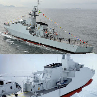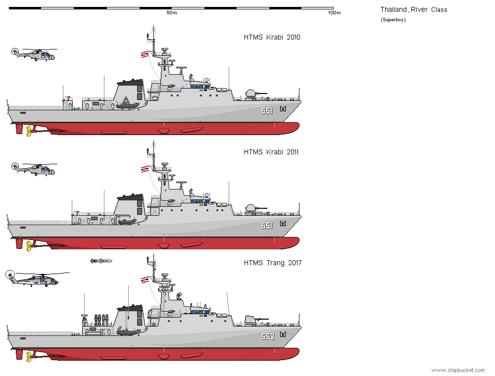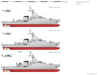ในภาพคือเรือชั้น River ของบราซิล (ภาพบน) และของอังกฤษ (ภาพล่าง) จะเห็นได้ว่า Superstructure ท้ายเรือมีอยู่แค่นี้แหละ สั้นกว่าเรือหลวงกระบี่และเท่ากับเรือหลวงตรัง ติดตั้งเครนขนาด 16 ตันตำแหน่งที่เราติดตั้งจรวดต่อสู้เรือรบ ไม่ทราบว่าใช้ยี่ห้อเฮี๊ยบหรือเปล่าหนอ