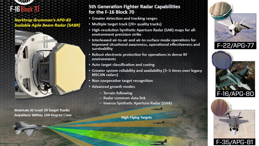 เรื่องราวทั้งหมดควรจบลงแต่เพียงเท่านี้ บังเอิญก็แต่ว่า F-16 ยังคงขายได้เนี่ยสิ Lockheed Martin จึงนำ Block 60 มาปรับปรุงให้เป็น Block 70 อายุใช้งานเพิ่มขึ้นเป็น 12,000ชั่วโมง แล้วยัดเรดาร์ AESA รุ่นใหม่นั่นก็คือ APG-83 SABR เข้าไป โดยที่เรดาร์สามารถติดตั้งกับ F-16 รุ่นเก่าได้ หรือจะข้ามไปเลือก APG-84 RACR จากอีกค่ายก็แล้วแต่ ประสิทธิภาพของเรดาร์ทั้ง 3 ตัวไม่ห่างกันเท่าไหร่ APG-80 อาจส่องสาวได้ไกลกว่าเพื่อนอยู่บ้าง แต่ SABR กับ RACR ทันสมัยกว่า ลูกเล่นแพรวพราวกว่า ราคาน่าจะถูกกว่า และค่าใช้จ่ายโดยรวมน้อยกว่า