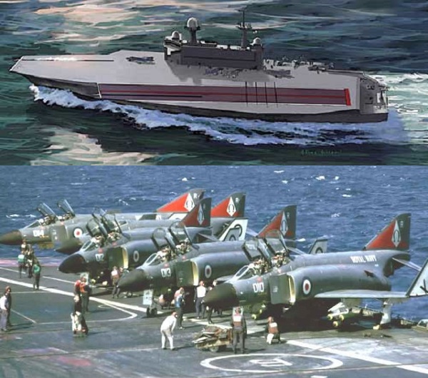 ก่อนหน้านี้ช่วงโครงการ P.1154 ยังหวานอยู่ กองทัพเรือได้ซุ่มพัฒนาเรือบรรทุกเครื่องบินขนาด 20,000 ตัน รองรับเครื่องบินขึ้นลงแนวดิ่งทางวิ่งสั้นความเร็ว 2 เท่าเสียง เมื่อเปลี่ยนมาเป็นแฟนทอมเรือก็เลยถูกดอง ครั้นโดนผีหลอก 3 ครั้งติดเรือก็เลยกลับมา เป็นการกลับมาแบบกล้า ๆ กลัว ๆ นะครับ เพราะมีคำสั่งซื้อจำนวน 1 ลำในปี 1973 ถัดมาอีก 3 ปีถึงได้สั่งซื้อลำที่ 2 กว่าเรือจะเข้าประจำการได้ก็ปาเข้าไปปี 1980 และ 1982 ตามลำดับ เมื่อรวมกับเรือ HMS Hermes เท่ากับมีเรือบรรทุกเครื่องบินจำนวน 3 ลำ และเครื่องบินขับไล่ความเร็วต่ำกว่าเสียงจำนวน 36 ลำ โดยไม่มีเครื่องบินโจมตีที่แท้จริงแม้แต่ลำเดียว เพราะ Buccaneer ใช้ลานสกีจัมป์บินขึ้นไม่ได้