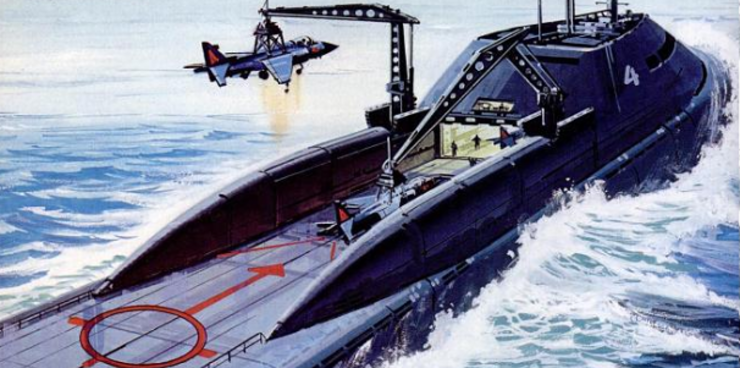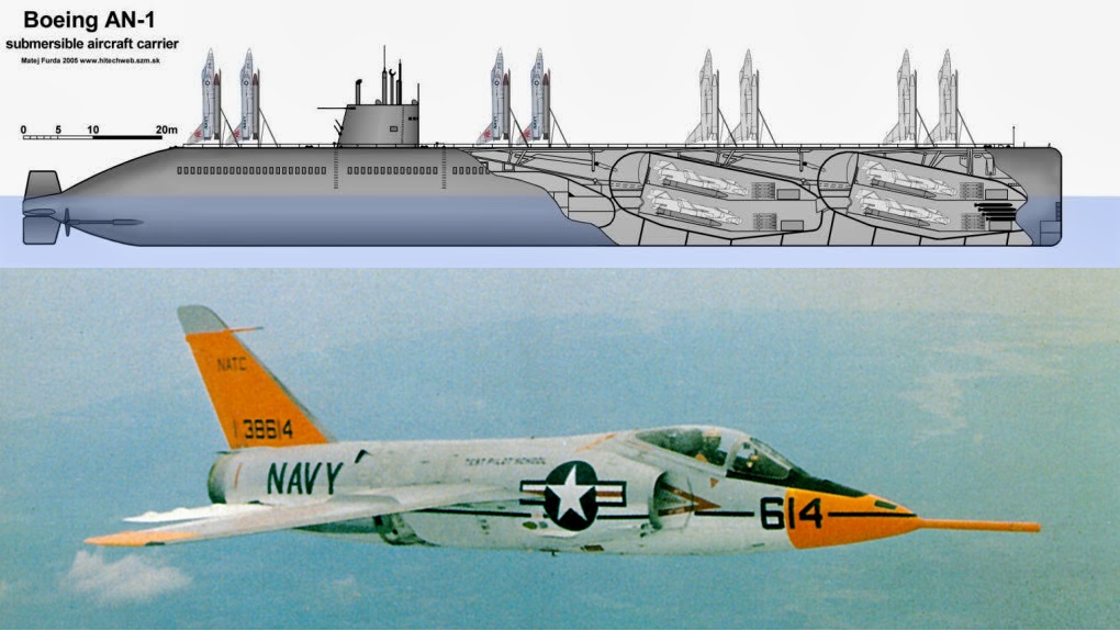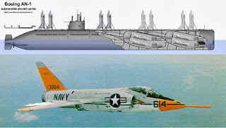 .นี่คือ Boeing AN-1 Submersible Aircraft Carrier หรือเรือดำน้ำบรรทุกเครื่องบินที่หลายชาติถวิลหา ใช้เรือดำน้ำพลังงานนิวเคลียร์เป็นยานแม่ ระวางขับน้ำ 9,260 ตันที่ผิวน้ำ และ 14,700 ตันขณะดำน้ำ ยาว 152.4 เมตร บรรทุกเครื่องบินขับไล่ F11F Tiger จำนวน 8 ลำ วิธีปล่อยเครื่องบินเหมือนกับปล่อยบั้งไฟ คือโหลดขึ้นมาวางบนดาดฟ้าเรือ ตั้งหัวเครื่องตรงแหนวเล็งไปที่ดวงดาว แล้วจุดระเบิดจรวดช่วยส่งหรือ Rocket Booster ส่งขึ้นไป พอถึงจุดเครื่องบินจะแยกตัวออกมาเอง