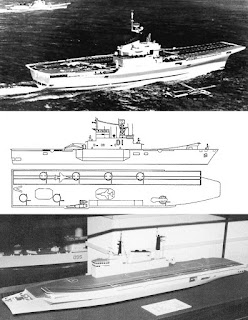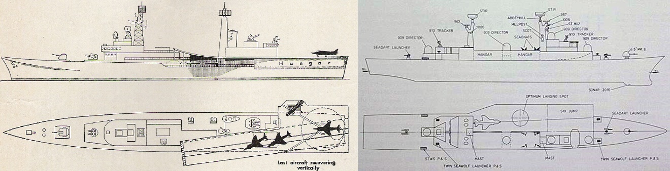 ชมของดีจากผู้ดีอังกฤษกันอีกซักนิด ภาพซ้ายมือคือโครงการ Light Carrier Cruiser เรือลาดตระเวนขนาดใหญ่ใส่ลานบินพร้อมสกีจัมป์ รองรับภารกิจป้องกันภัยทางอากาศ มีทั้งแฮริเออร์และจรวดต่อสู้อากาศยานระยะไกล เป็นแนวความคิดที่ออกจะล้าสมัยไปนิด ราคาแพงเกินเหตุรัฐบาลไม่ยอมจ่ายแน่ ทว่านี่คือ Crossover Ship ที่แท้จริงในยุคสงครามเย็น