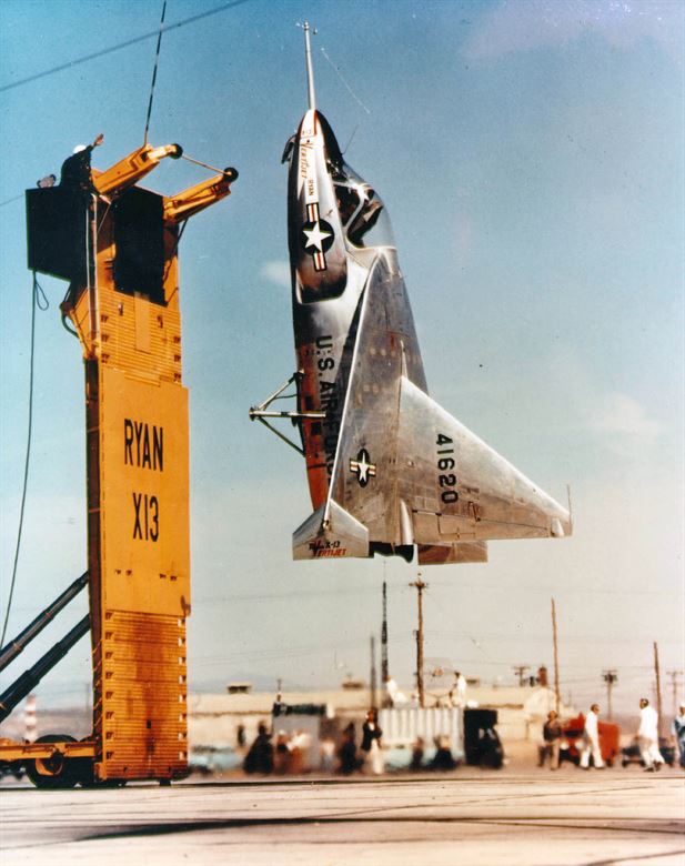 Ryan X-13 Vertijet มีขนาดค่อนข้างเล็กมาก เป็นเครื่องบินปีกสามเหลี่ยมรูปทรงล้ำสมัย ใช้เครื่องยนต์ตัวเดียวพร้อมท่อปรับแต่งทิศทาง ควบคุมการหมุนด้วย jet reaction control ติดตั้งอยู่ปลายปีกด้านใน นี่คืออากาศยานที่ลอยออกมาจากการ์ตูน ผ่านนิยายวิทยาศาสตร์เข้าสู่ชีวิตรันทด ต้นแบบทั้ง 2 ลำไม่มีการติดตั้งอาวุธ ไม่ได้ไปต่อเพราะมีอย่างอื่นที่ดีกว่า