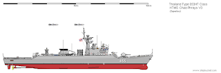 เรามาดูแบบเรือ V3 กันต่อนะ แบบเรือสุดท้ายเน้นภารกิจปราบเรือดำน้ำ นับเป็นแบบเรือ V2 รุ่นประหยัดก็เห็นจะไม่ผิด ใช้ปืนใหญ่ 76/62 มม.รุ่น Rebuilt ปืนกลอัตโนมัติ DS30M Mk2 หัวเรือติดแค่เพียง 1 กระบอก โดยติดตรงกลางเลื่อนมาข้างหน้าประมาณ 1 เมตร (ตรงที่ติดปืนยิงสลุตนั่นแหละครับ) เพื่อให้มีมุมยิงกว้างกว่าเดิม และหลบช่องทางขึ้นลงฉุกเฉินของเรือ ออปโทรนิกควบคุมการยิง EOS500 ถูกโยกไปไว้ด้านหลัง ไม่มีแท่นยิง MK29 กับอาวุธนำวิถีต่อสู้อากาศยาน ESSM ให้ใช้แบบประทับบ่ายิงก็แล้วกัน (แบกขึ้นเรือกันเหนียวสัก 2 กล่อง อยากยิงตรงไหนของเรือก็ตามสะดวก) มีพื้นที่อเนกประสงค์ท้ายเรือเหมือนเดิม บังเอิญกองทัพเรือยังไม่มีอากาศยานไร้คนขับ ผู้เขียนก็เลยไม่ได้กล่าวถึงในท้องเรื่อง