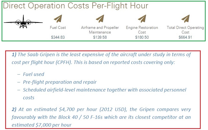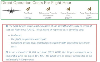 ตัวอย่างที่สองอยู่ในสี่เหลี่ยมสีแดงด้านล่าง จากรายงานของนิตยสารทางทหารฉบับหนึ่ง ในรายงานระบุค่าใช้จ่ายต่อชั่วโมงบินของ Gripen ในปี 2012 เท่ากับ 4,700 เหรียญต่อชั่วโมง เทียบกับเครื่องบิน F-16 Block 40/50 ซึ่งอ้างอิงจากรายงาน Study กองทัพอากาศอเมริกาในปี 2005 ว่าเท่ากับ 7,000 เหรียญต่อชั่วโมง โดยมีวิธีการคิดคำนวณตามสูตรนี้
