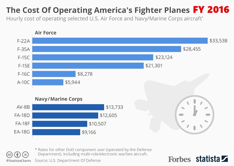 นี่คือค่าใช้จ่ายต่อชั่วโมงบินตั้งแต่ปี 2014 ถึงปี 2019 ผู้เขียนขอไล่จากล่างสุด (ค่าใช้จ่ายน้อยสุด) ขึ้นไปยังบนสุด (ค่าใช้จ่ายมากสุด) เริ่มจาก A-10 ปรกติสุขทุกประการ ค่าใช้จ่ายน้อยลงกว่าเดิมเล็กน้อย ส่วน F-16C ก็เช่นเดียวกัน ขณะที่ F/A-18E มีค่าใช้จ่ายสูงขึ้นเล็กน้อย ที่น่าหนักใจก็คือ F/A-18C ซึ่งพุ่งพรวดไปไกลลิบ (จากเคยใกล้เคียง F/A-18E ในปี 2014 ) ปัญหานี้กองทัพเรืออเมริกาไม่หนักใจเลย เพราะฝูงบิน VFA-34 Blue Blasters ซึ่งยังคงใช้งาน F/A-18C เป็นฝูงท้าย ได้ปลดประจำการไปเมื่อวันที่ 1 กุมภาพันธ์ 2019 ที่ผ่านมา เหลือแค่เพียงนาวิกโยธินเหล่าเดียวเท่านั้น