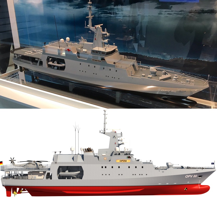 เป็นเรือจากเยอรมันกันอีกแล้ว อู่ต่อเรือ Lurssen จับมือกับ ASC ผู้เป็นเจ้าถิ่น เสนอแบบเรือ OPV 80 ซึ่งเคยสร้างให้บรูไนมาแล้วถึง 4 ลำ ระวางขับน้ำ 1,640 ตัน ยาว 80 เมตร กว้าง 13 เมตร บั้นท้ายสูงเหมือนเรือ Austal แต่ผอมเพรียวกว่ากัน ติดปืนกล 40 มม.หน้าตาประหลาดดี ตั้งตู้ Mission Mudule หลังปล่องระบายความร้อน ไม่มีโรงเก็บเฮลิคอปเตอร์ มีเรือยาง RHIB ขนาด 8.5 เมตร 2 ลำ และเรือยาง Interceptor ขนาด 11.5 เมตรอีก 1 ลำ