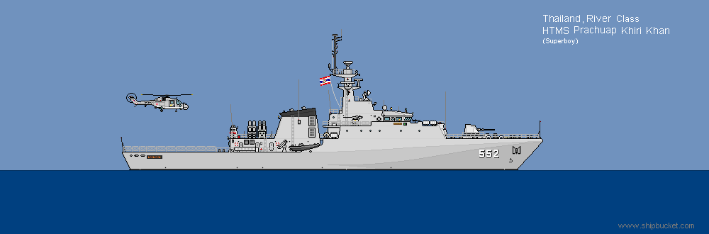 นี่คือภาพวาดเรือหลวงประจวบคีรีขันธ์ ใส่จรวดต่อสู้เรือรบ Harpoon จำนวน 4 นัดตามมาตรฐาน หน้าที่สำคัญของเรือก็คือตรวจการณ์ จำเป็นต้องส่งเรือเล็กไปตรวจค้นเรือประมงเอย เรือน้ำมันเอย เรือสินค้าเอย รวมทั้งเรือที่แอบบุกรุกเข้ามาในน่านน้ำ เรือหลวงประจวบคีรีขันธ์บรรทุกเรือยาง RHIB ได้ 2 ลำ ตรงตามมาตรฐานไม่ใช่จุดเด่นและไม่ใช่จุดด้อย ขึ้นและลงโดยใช้เครนที่อยู่สองกราบเรือ แต่ยาวกี่เมตรบรรทุกได้กี่คนผู้เขียนไม่ทราบ