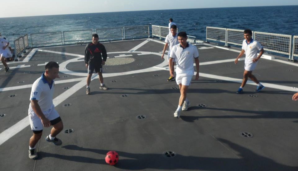 นี่คือภาพเส้นทางเรือของหน่อยฝึก (โรงเรียนนายเรือ) ในปี 2013 เรือหลวงกระบี่เดินทางจากกรุงเทพไปสิ้นสุดที่ภาคใต้ออสเตรเลีย ก่อนวนกลับมาโดยมีการแวะเยี่ยมเยี่ยมตามรายทาง นักเรียนนายเรือรุ่นที่ 107 ออกฝึกในทะเลถึง 74 วัน เป็นประสบการณ์ที่ดีก่อนเข้ารับราชการ ลานจอดเฮลิคอปเตอร์ได้กลายมาเป็นพื้นที่อเนกประสงค์ สำหรับการออกกำลังกายของนักเรียนและกำลังพล เหมือนๆ กับที่เราออกไปวิ่งบ้าง เดินบ้าง ส่องสาวบ้าง ทุกเมื่อเชื่อเย็นแถวบ้านนั่นแหละครับ งานนี้ไม่ได้แบกจรวดต่อสู้เรือรบไปด้วย ต้องการลดน้ำหนักเพราะมีคนเพิ่มจนกลายเป็น 170-180 นาย