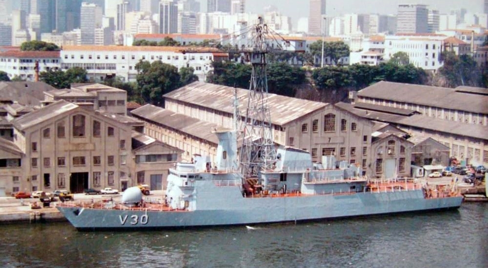 ในภาพคือเรือ V30 Inhaúma สร้างเสร็จทั้งลำแล้วในปี 1988 แต่ยังเก็บงานไม่เรียบร้อยมีแค่ปืนใหญ่หัวเรือกระบอกเดียว นี่คือเรือคอร์เวตซึ่งถูกออกแบบโดยคนบราซิล และสร้างขึ้นเองภายในประเทศโดยคนบราซิล