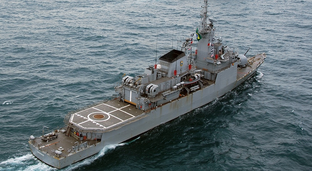 จะเห็นได้ว่าเรือบราซิลใช้ตัวอักษร V นำหน้าหมายเลขเรือ ต่างเรือฟริเกตใช้ซึ่งใช้ตัวอักษร F เหมือนกับประเทศอื่นๆ รูปทรงคล้ายเรือปลายยุค 70 ถึงต้นยุค 80 นั่นแหละครับ หัวเรือติดปืนใหญ่ขนาด 4.5 นิ้วหนึ่งกระบอก กลางเรือมีแท่นยิงจรวดต่อสู้เรือรบกับแท่นยิงตอร์ปิโดเบาปราบเรือดำน้ำ ตัวเรือยกสูงหนึ่งชั้นยาวมาถึงลานจอดเฮลิคอปเตอร์ ด้านข้างโรงเก็บเป็นจุดติดตั้งปืนต่อสู้อากาศยาน ท้ายเรือถูกตัดให้ต่ำลงใช้เป็นจุดผูกเชือกท้ายเรือ เรือลำนี้ถูกแบ่งสร้างเป็นบล็อกแล้วนำมาประกอบภายหลัง ใช้เทคโนโลยีใหม่เอี่ยมอ่องกันเลยทีเดียว อ่านดูคร่าวๆ คิดว่าเข้าทีและเป็นเรือรบที่ดีมากลำหนึ่ง