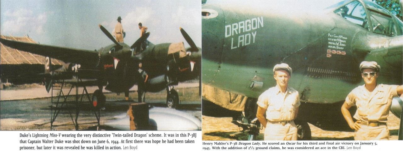 เครื่องบินขับไล่ทิ้งระเบิด P-38 Lightning จากฝูงบิน 459 ลายเขียวเข้มท้องขาวคุ้นตาคนไทยภาคเหนือ ลำขวามือมีเครื่องหมายลูกระเบิดและเครื่องบินข้าศึก แสดงให้เห็นถึงความร้ายกาจมีพิษสงรอบตัว