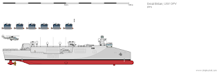 ลำนี้คือเรือตรวจการณ์ไกลฝั่งบรรทุกยานผิวน้ำไร้คนขับ เรียกชื่อสั้นๆ ว่า USV OPV ของบริษัท UCL ของแปลกแบบนี้หาได้จากประเทศเดียว เรือมีความยาว 104 เมตร ระวางขับน้ำ 3,000 ตัน ติดปืนกลอัตโนมัติ Mk-46 30 มม.4 กระบอก แท่นยิง TETRAL สำหรับจรวดต่อสู้อากาศยาน Mistral อีก 2 แท่น (จำนวนรวม 8 นัด) บรรทุก USV มาด้วยกันมากสุด 6 ลำ มีเรือยาง RHIB แยกต่างหากอีก 2 ลำ ท้ายเรือมีลานจอดพร้อมโรงเก็บเฮลิคอปเตอร์แบบพับได้